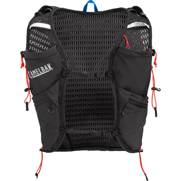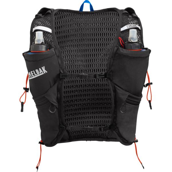 Vesten er designet ultralette og har en førsteklasses passform som holder den på plass selv i raske løp. På fronten er det to elastiske lommer for Quick Stow 0,5 L-flasker (inkl.), slik at løperen kan ha én flaske med sportsdrikk og én med vann.