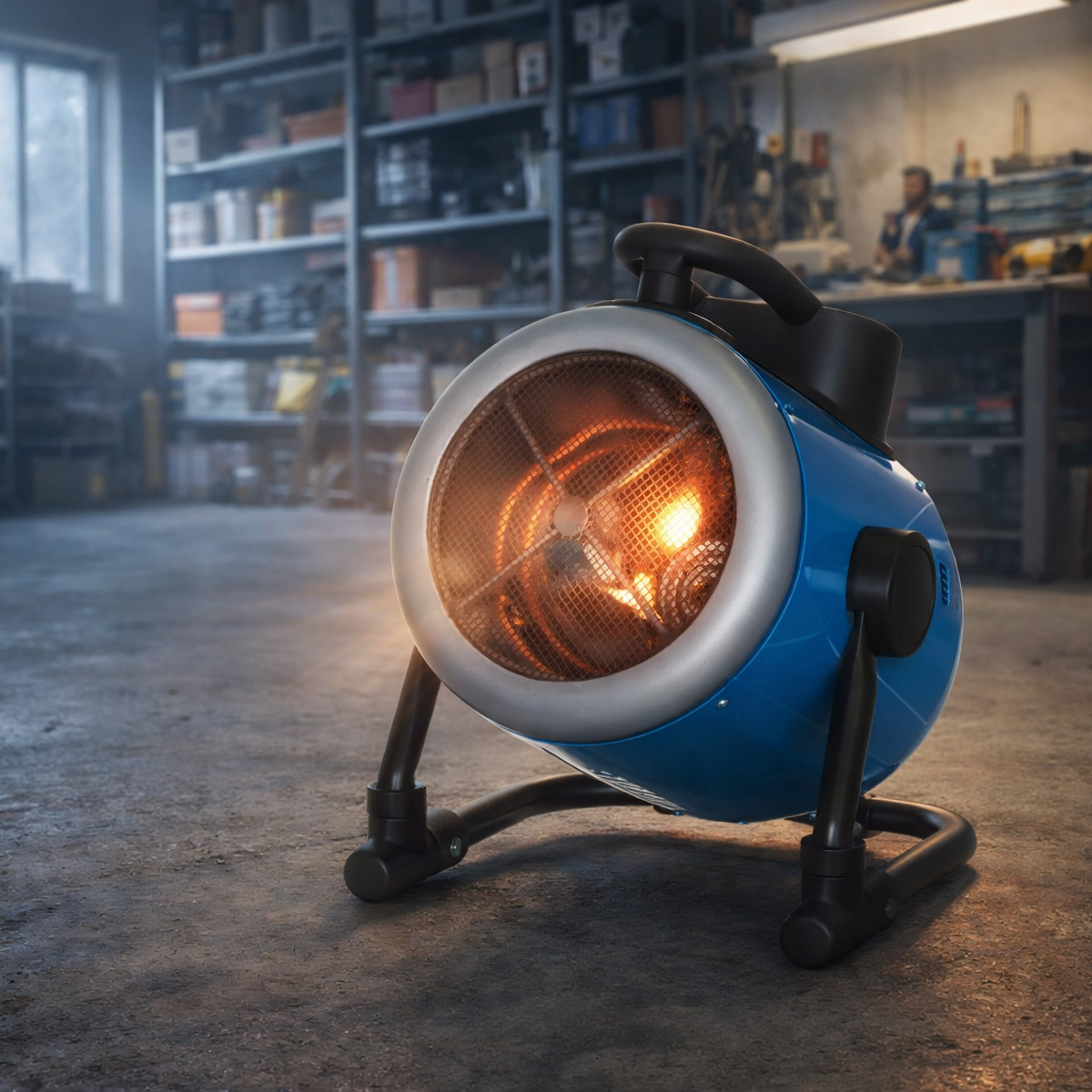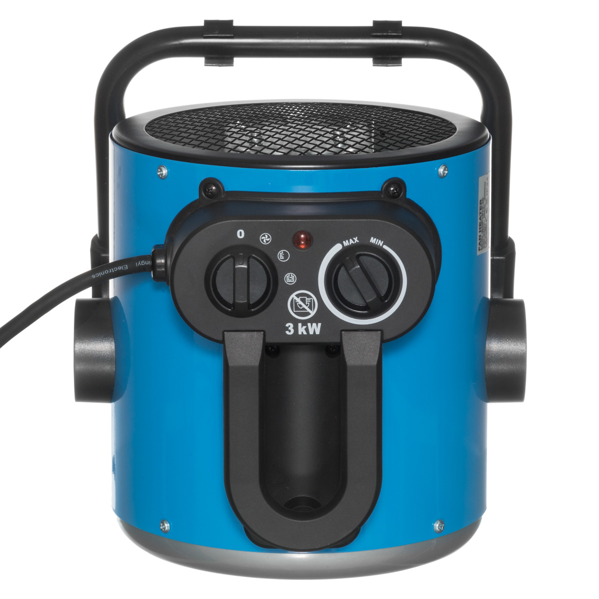 Høykvalitets industriell varmer med effektivt og raskt spiralvarmeelement i rustfritt stål. To varmeinnstillinger og viftefunksjon. Kun vifte 25 W (kjøling), varme 1500 W og 3000 W. Blåsevinkelen kan justeres ca. 40 grader. Overopphetingsvern. Metallkabinett, isolerte ben og håndtak. Oppvarmingsareal 30 m2. Luftmengde 304 m3/t. 220–240V 50Hz. IP24. Garanti 2 år.