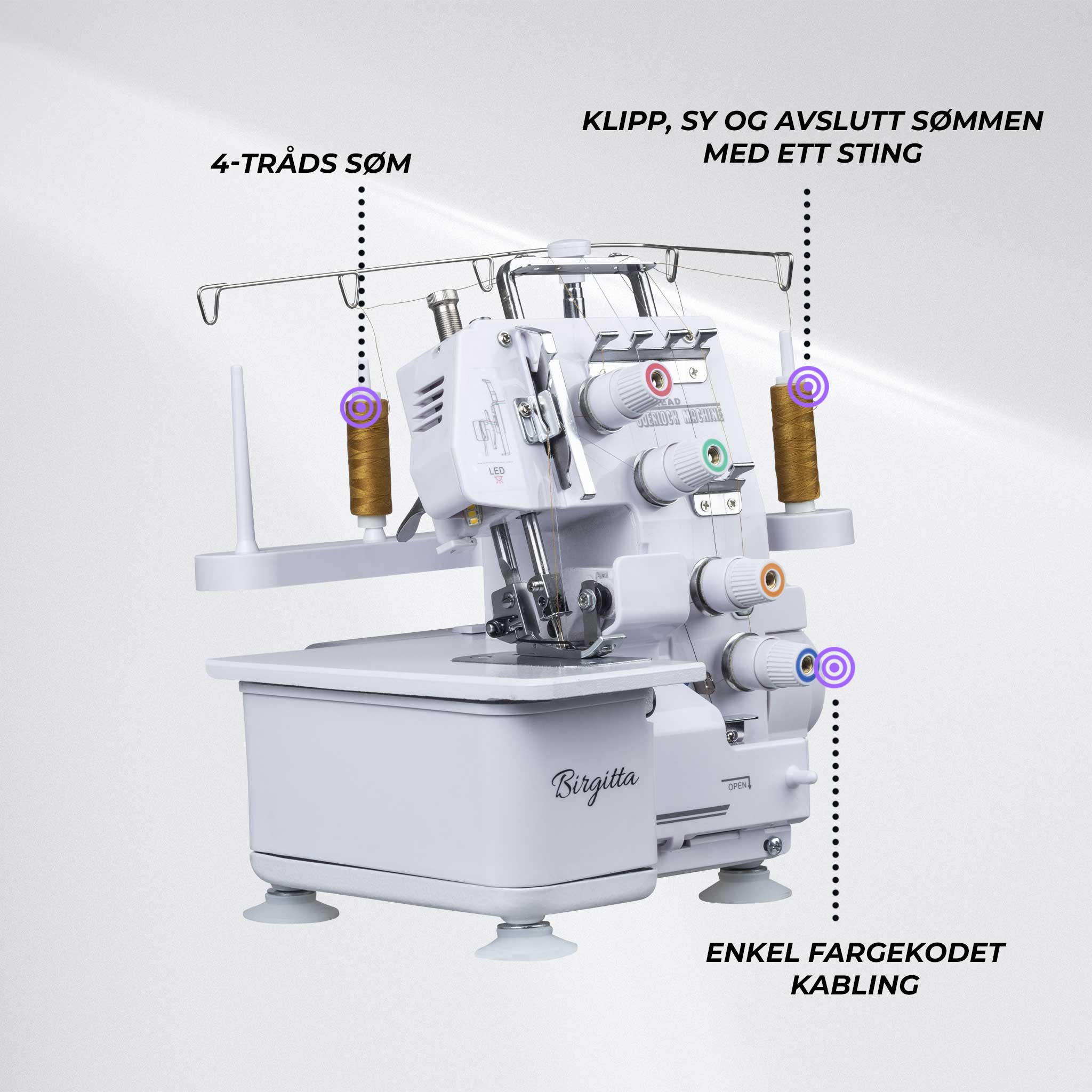 Birgitta Standard gjør sying raskere enn med en standard symaskin. Takket være bruk av flere tråder, lager overlock-maskinen sømmer som er holdbare og vakkert ferdige. Birgitta Standard er klar til bruk så snart du slår den på, og sying er enkelt med den elektriske pedalen.