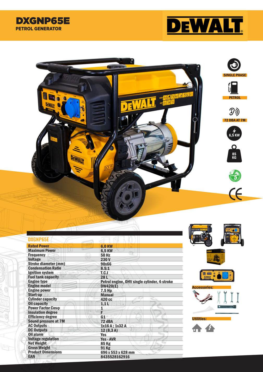 DeWalt generator DXGNP65E er et bensindrevet, kraftig aggregat som egner seg best for mobil bruk takket være hjulene. DXGNP65E har en maksimal effekt på 6500 W og kan gå kontinuerlig i opptil 11 timer selv under belastning. Den 28 liters drivstofftanken sikrer problemfri drift over lange perioder.
