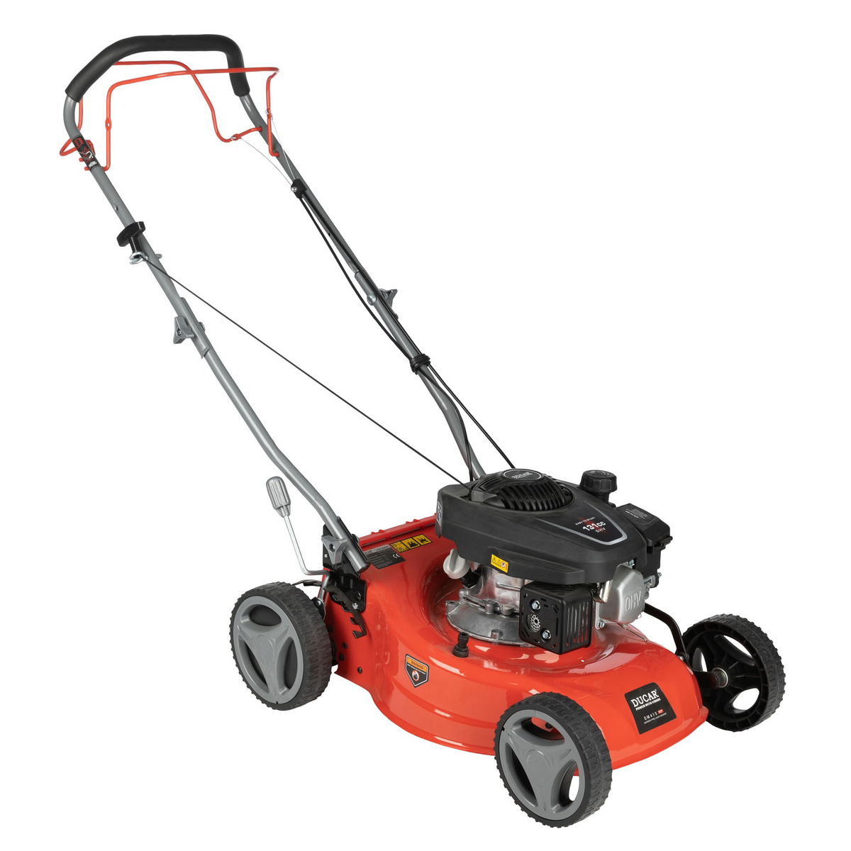 Ducar selvgående gressklipper DM41S med oppsamler, 7-trinns høydejustering, økonomisk DV130-motor og 410 mm klippebredde. Håndputer som komfortutstyr. To valgfrie klippemetoder: bakoppsamling eller bakutkast.