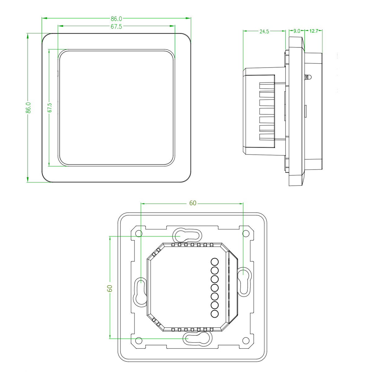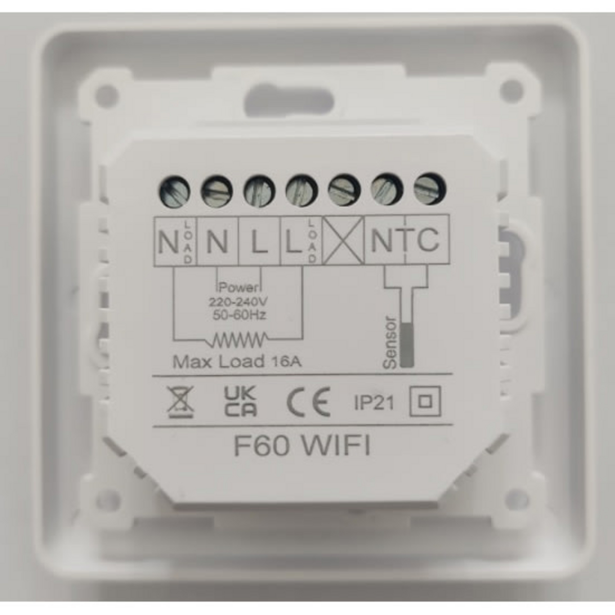 DunWore kombitermostat F60 WiFi. Kombinasjonstermostat med digitalt display. Termostaten mÄler bÄde rom- og gulvtemperatur. Innbyggbar i veggboks. Enkel styring via berøringsskjerm.