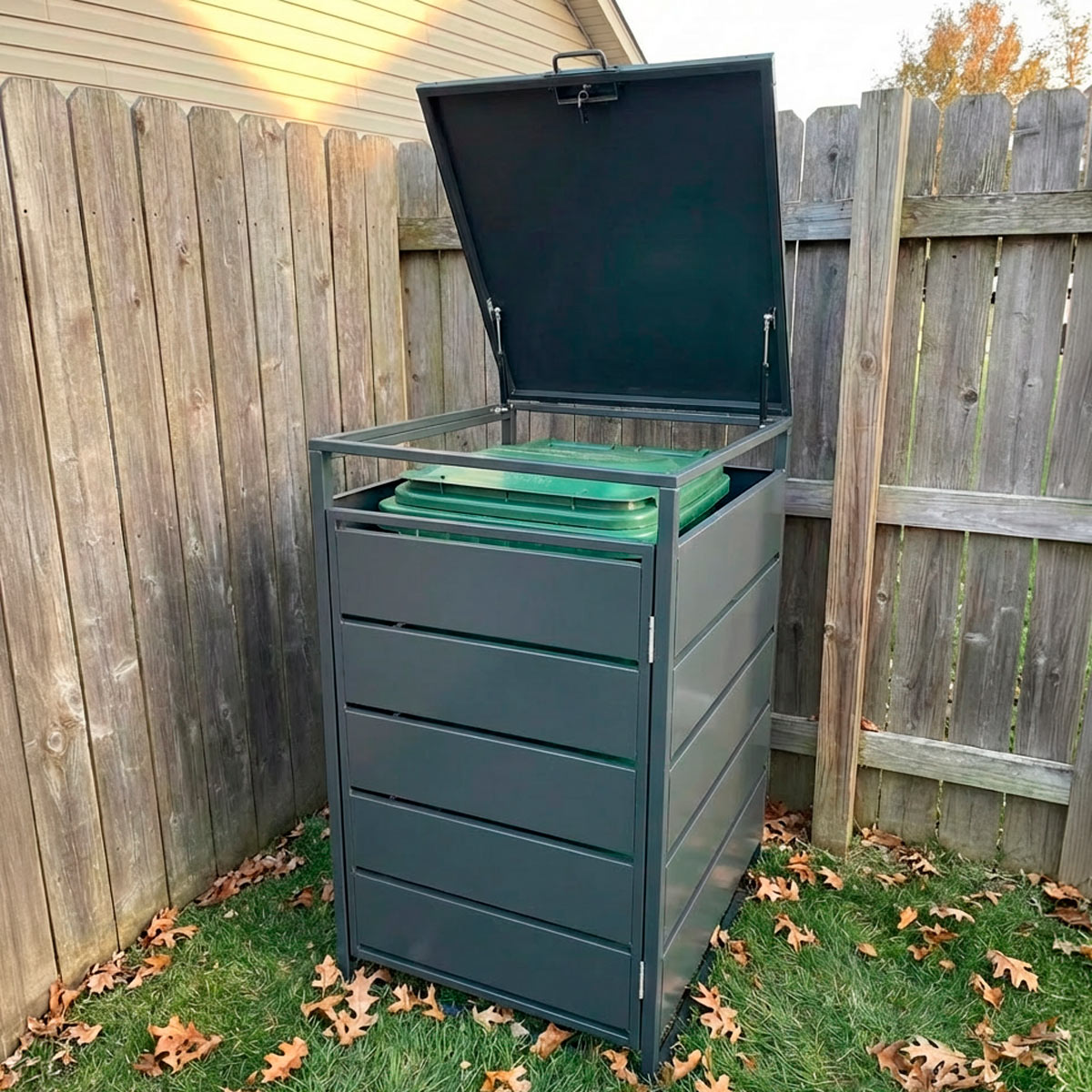 Fornorth Søppelskur Premium er ikke bare praktisk, men også en holdbar og vedlikeholdsvennlig løsning. Det beskytter søppeldunkene dine mot vær og vind, og bidrar til å opprettholde et ryddig og estetisk utseende. Velg Fornorth Søppelskur Premium for en pålitelig og effektiv måte å håndtere dine avfallsbehov utendørs.