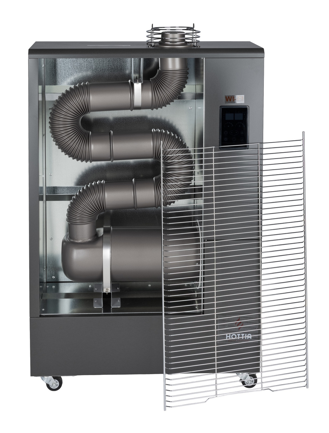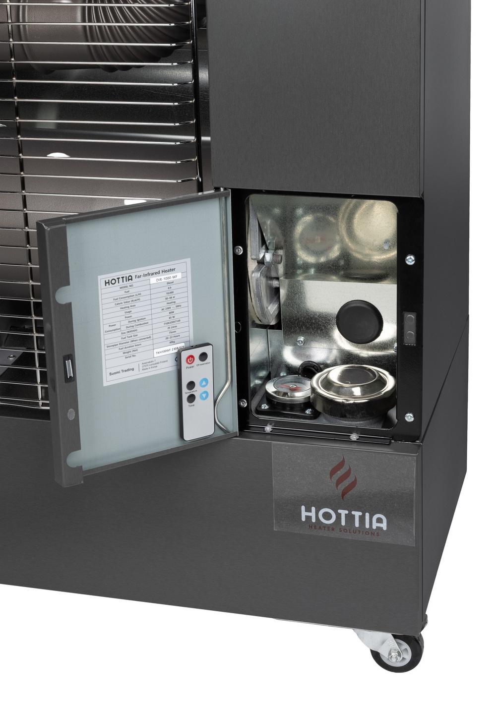 Infrarød stråling fra Hottia diesel infrarød varmer varmer opp faste materialer i oppvarmingssonen, som fungerer som et varmeutjevnende og varmeakkumulerende materiale. Fra materialene i rommet overføres varmen jevnt og behagelig til omgivelsene. Varmen fra Hottia-varmere blir aldri for varm. Den flerkomponentige og høyeffektive forbrenningsprosessen, samt den presist kontrollerte drivstofftilførselen, sørger for at ingen ubehagelige lukter eller karbonmonoksid slippes ut i luften. Hottia-varmere krever ikke røykavtrekk så lenge rommet som skal varmes er tilstrekkelig og korrekt ventilert. For å sikre personsikkerheten anbefales det å bruke et avtrekk for avgasser ved oppvarming av oppholdsrom.
