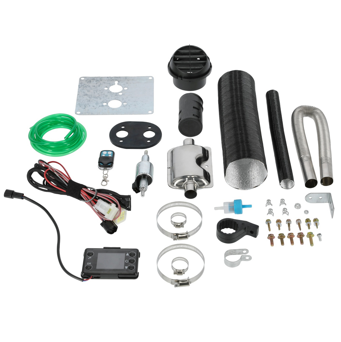 Varmeenhet med kontrollpanel, Fjernkontroll, Luftfilter, Luftslangerister, Demper, Elektrisk kabling, Bunnplate, Drivstoffpumpe, Drivstoffslanger, Luftinntaks- og luftutløpsslanger, Klemmer og skruer, 5 liters drivstofftank, Eksosrør.