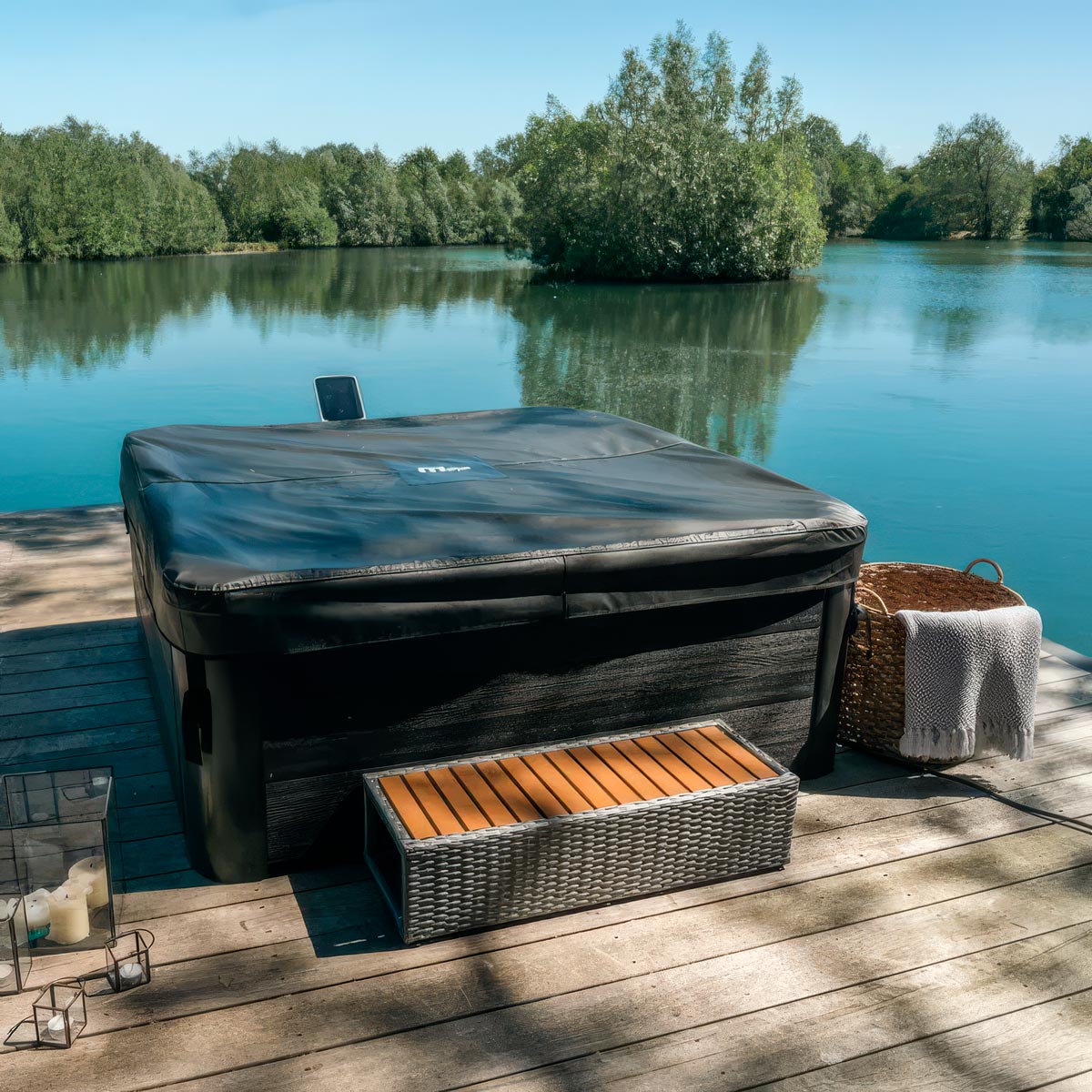 Utvendig har den en mørkegrå trelook som glir vakkert inn på enhver terrasse eller i enhver hage. Innvendig gir det lysegrå, lettstelte PVC-belegget badekaret et friskt uttrykk. Selv om det er oppblåsbart, er strukturen solid og stabil, samtidig som den er enkel å flytte, sette opp og lagre etter behov.