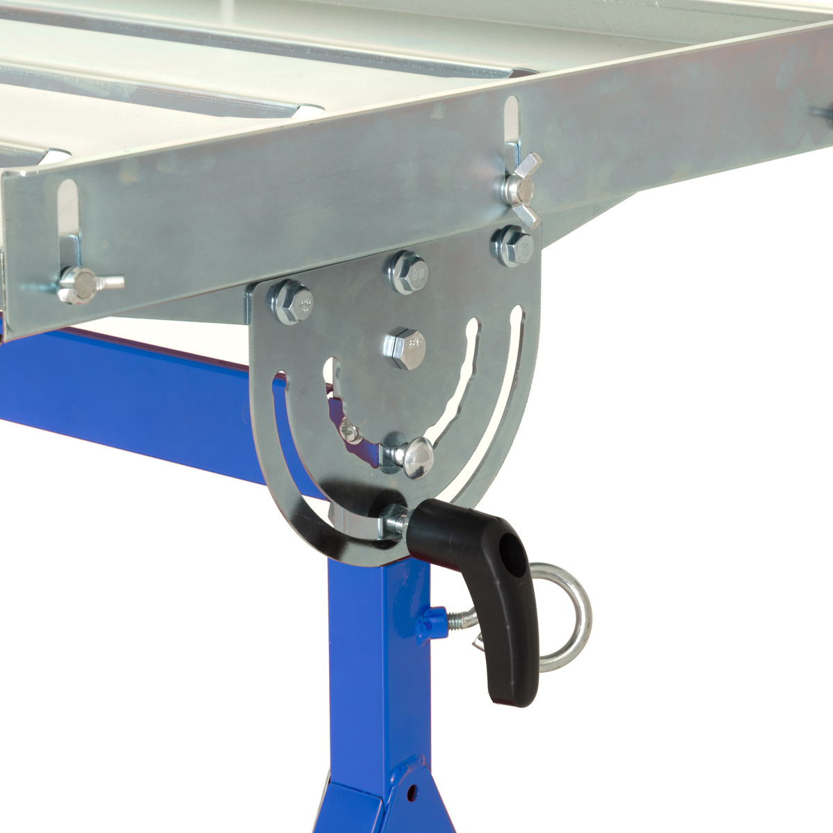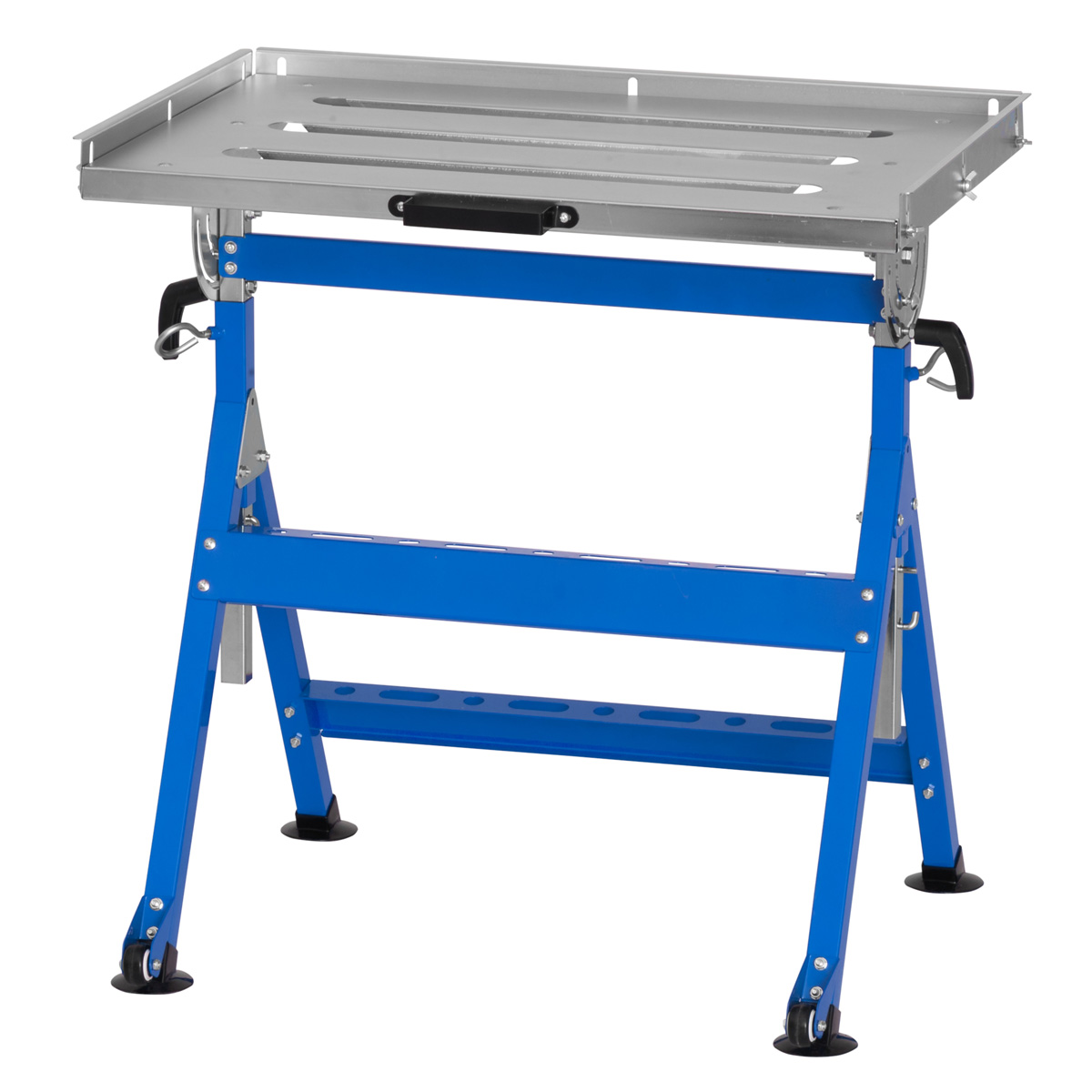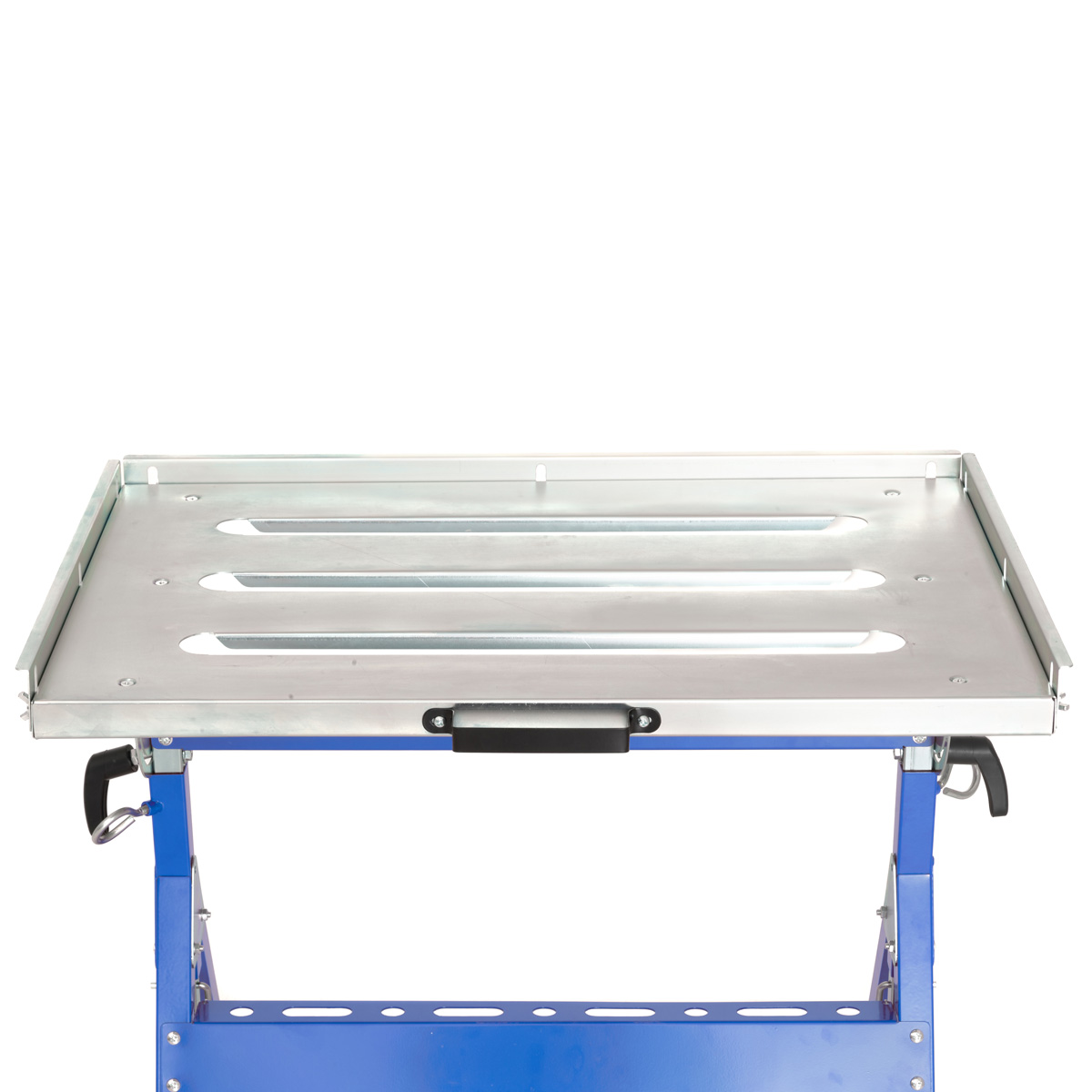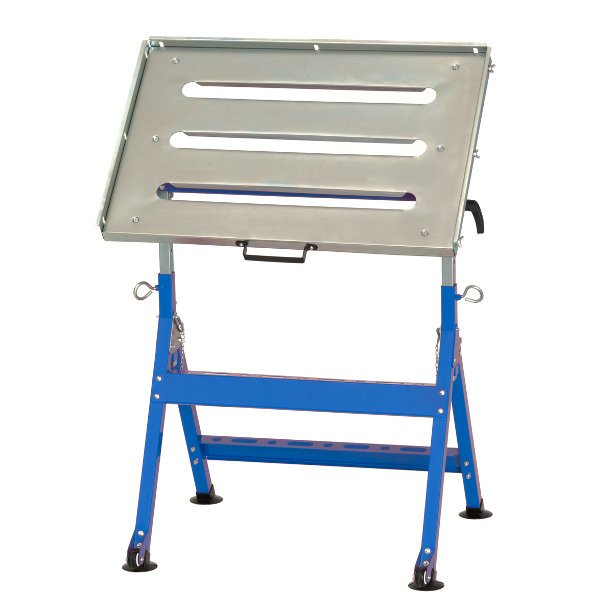 Sammenleggbart og justerbart sveisebord. Justerbar arbeidshĆøyde 780ā930 mm, vinkeljustering 0ā90 grader. Kan slĆ„s sammen til liten stĆørrelse og er enkel Ć„ ta med. SmĆ„ hjul og trekkhĆ„ndtak gjĆør bordet lett Ć„ flytte. Arbeidsplate i galvanisert stĆ„l 760x510 mm. Maks belastning 150 kg.