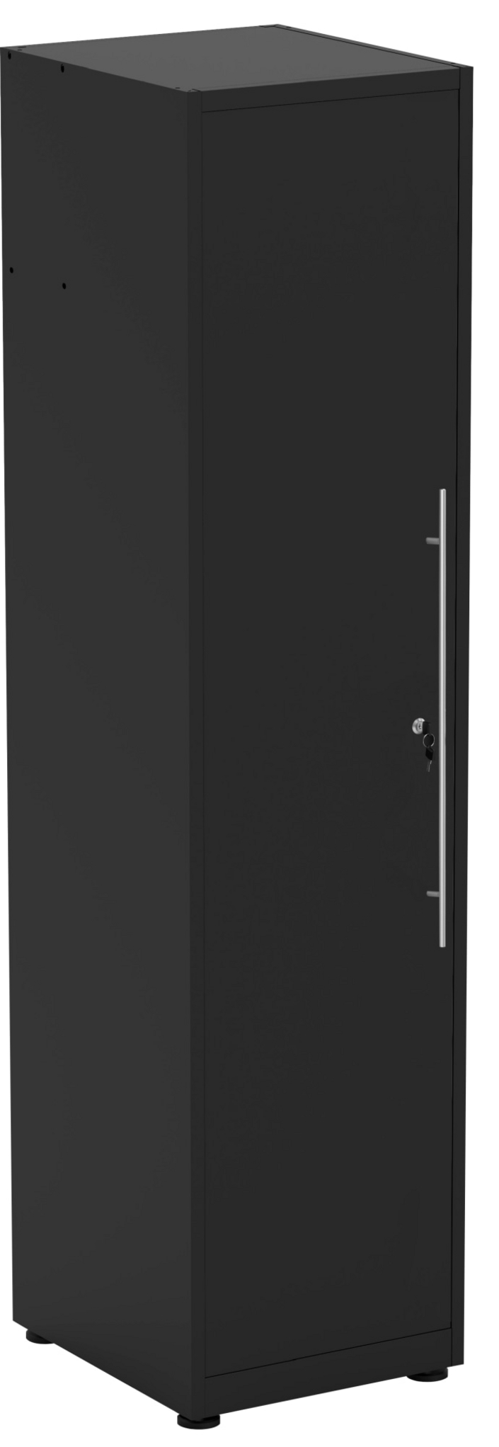 Mellomrommet er fylt med perforerte panelvegger, som kan utstyres med kroker, stativer, hyller osv. for verktøy og tilbehør etter ønske. Både de høye skapene og begge skuffeseksjonene kan låses. To nøkler følger med i leveransen.