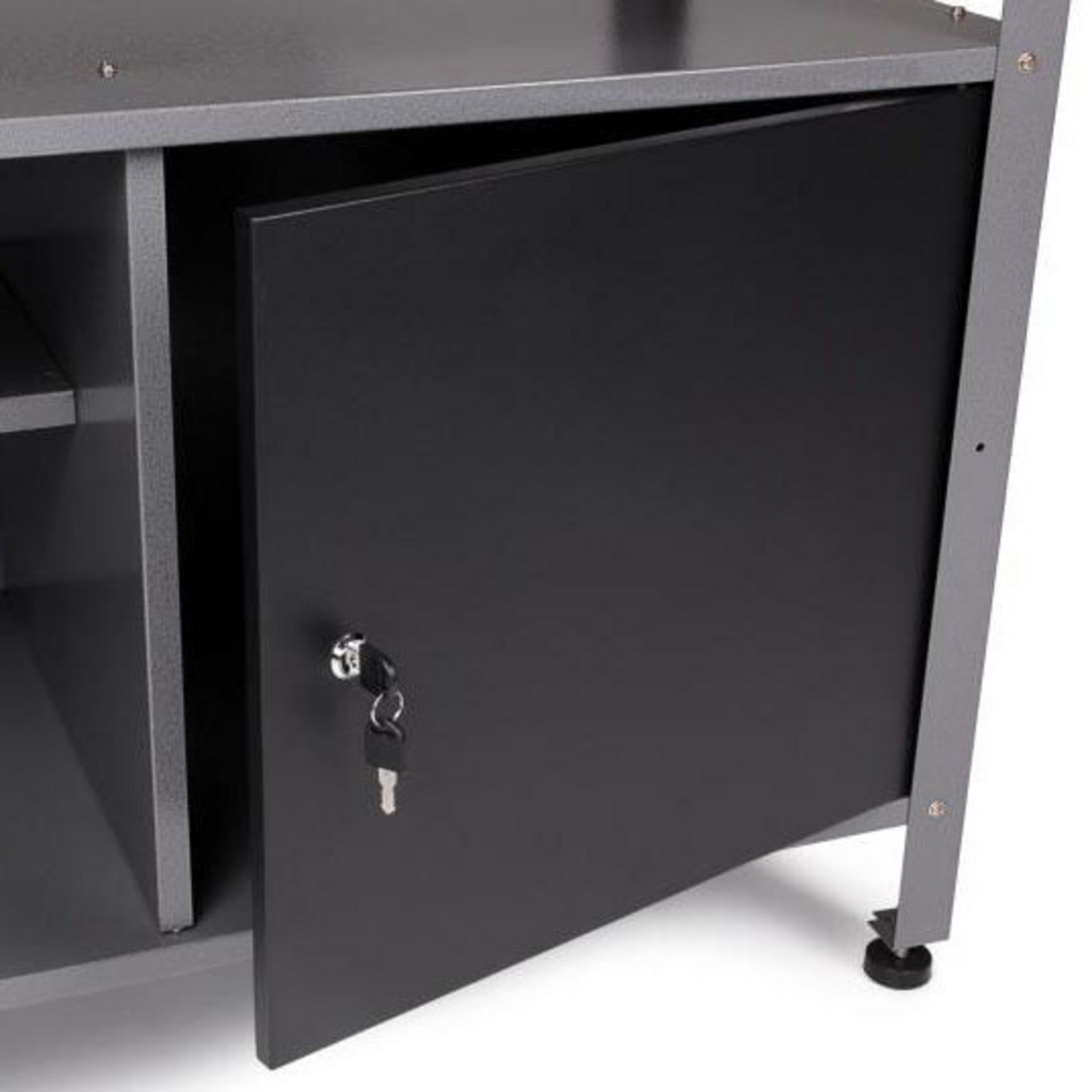 Mellomrommet er fylt med perforerte platevegger, som kan brukes til å montere kroker, holdere, hyller osv. for verktøy og tilbehør. Alle ni skapene og verktøyvognen kan låses. To nøkler følger med i leveransen.