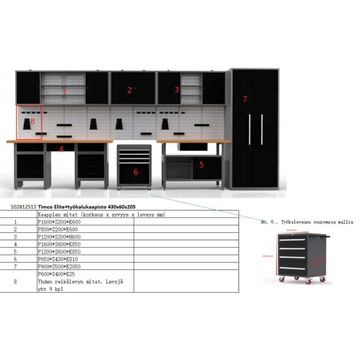 En prefabrikkert enhet for staller, verksteder og lagre, med en solid ramme og skuffer med kulelager. Et møbelsett med et høyt tilbehørsskap, ni små skap og fire skuffer. Rammeverket til bordet er i pulverlakkert stål, og bordplatene er laminert i tre.