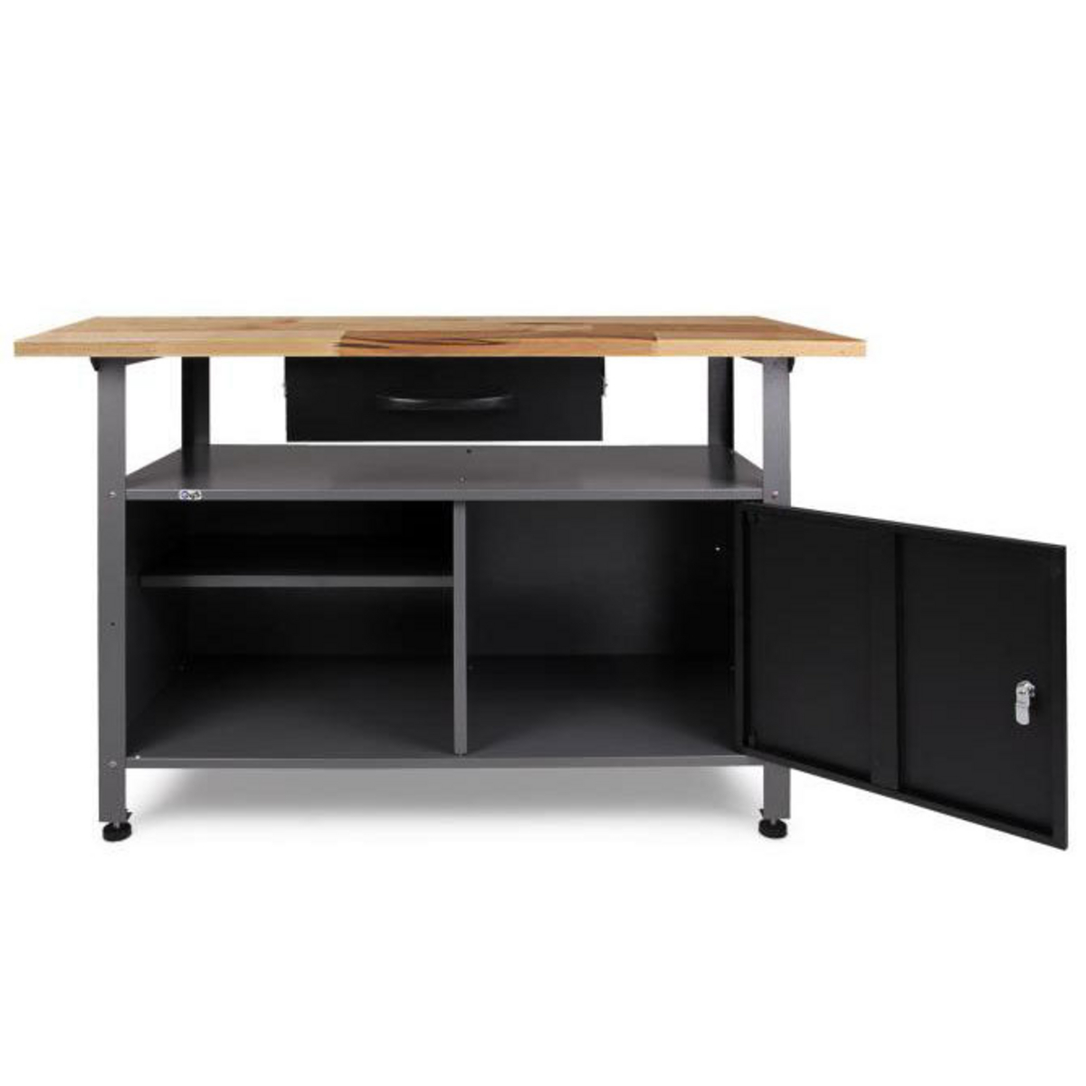 En prefabrikkert enhet for staller, verksteder og lager, med en robust ramme og skuffer med kulelager. Et sett med enheter med et høyt tilbehørsskap, tre små skap og en skuff. Bordrammen er laget av pulverlakkert stål, og bordplaten er laget av slitesterk sponplate laminert med tre.