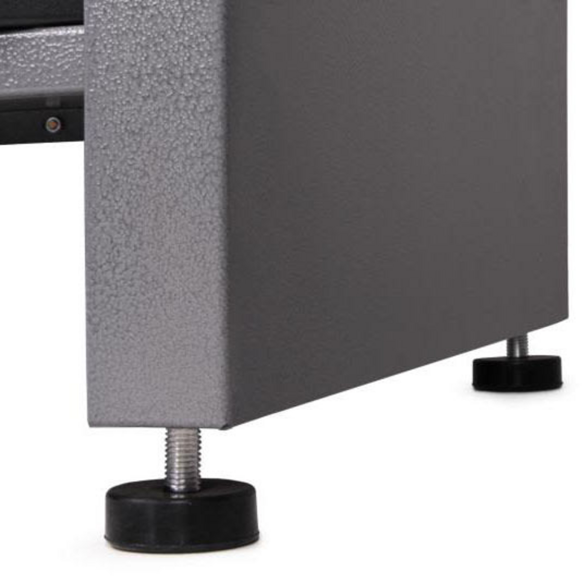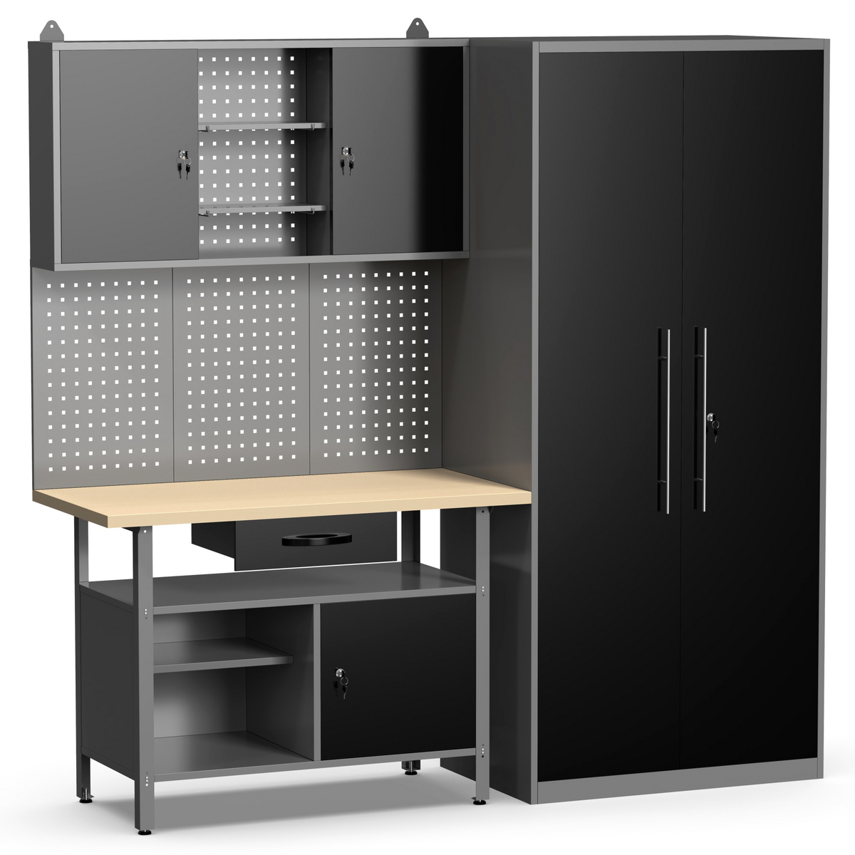 Mellomrommet er fylt med perforerte panelvegger hvor kroker, hyller, vater osv. for verktøy og tilbehør kan monteres om ønskelig. Det høye skapet og de tre mindre skapene kan alle låses. To nøkler medfølger.