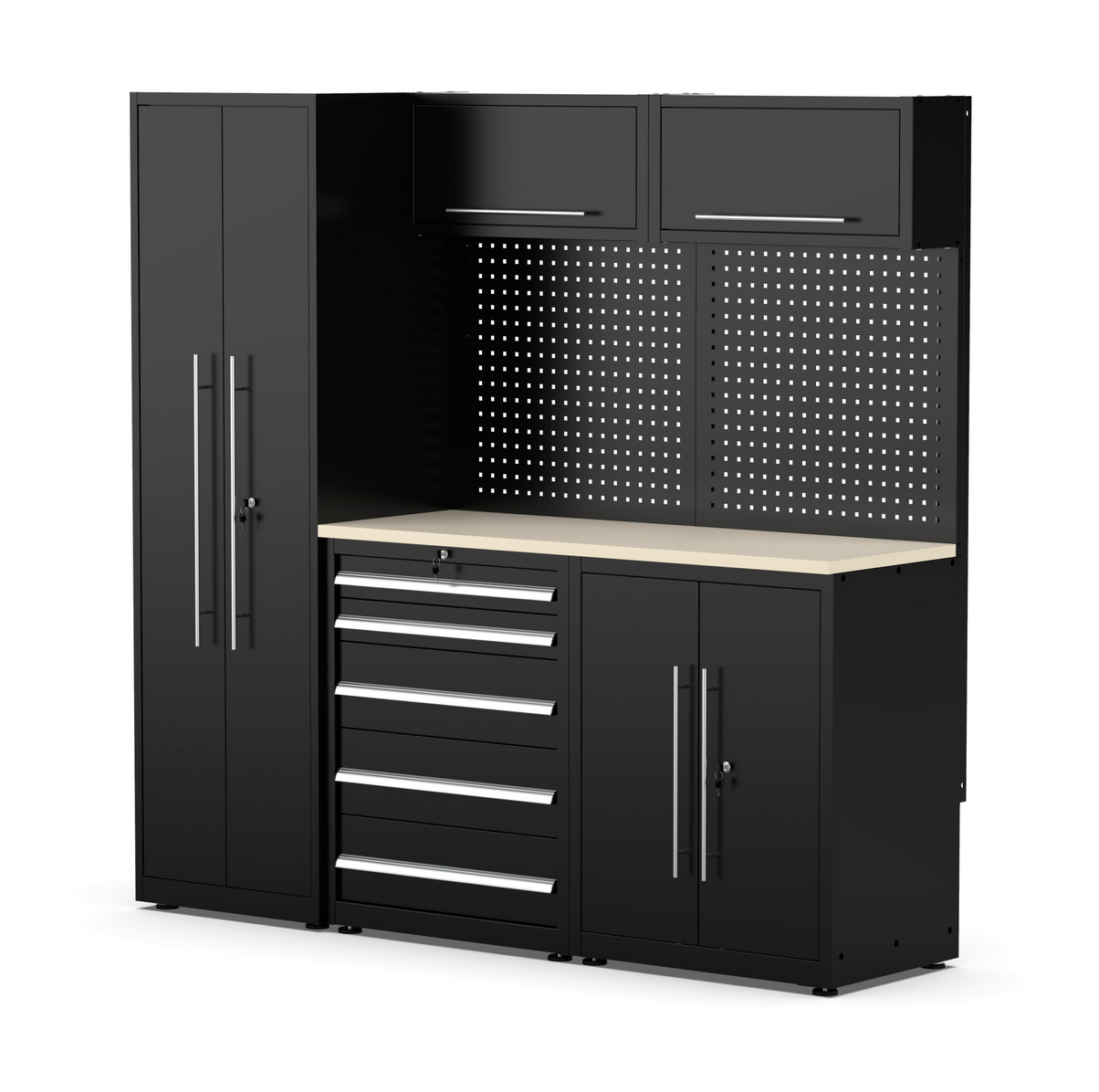 Mellomrommet er fylt med perforerte panelvegger hvor du kan montere kroker, hyller, vater osv. for verktøy og tilbehør. Det høye skapet, det lave skapet og skuffeenheten er alle låsbare. Leveransen inkluderer to nøkler.