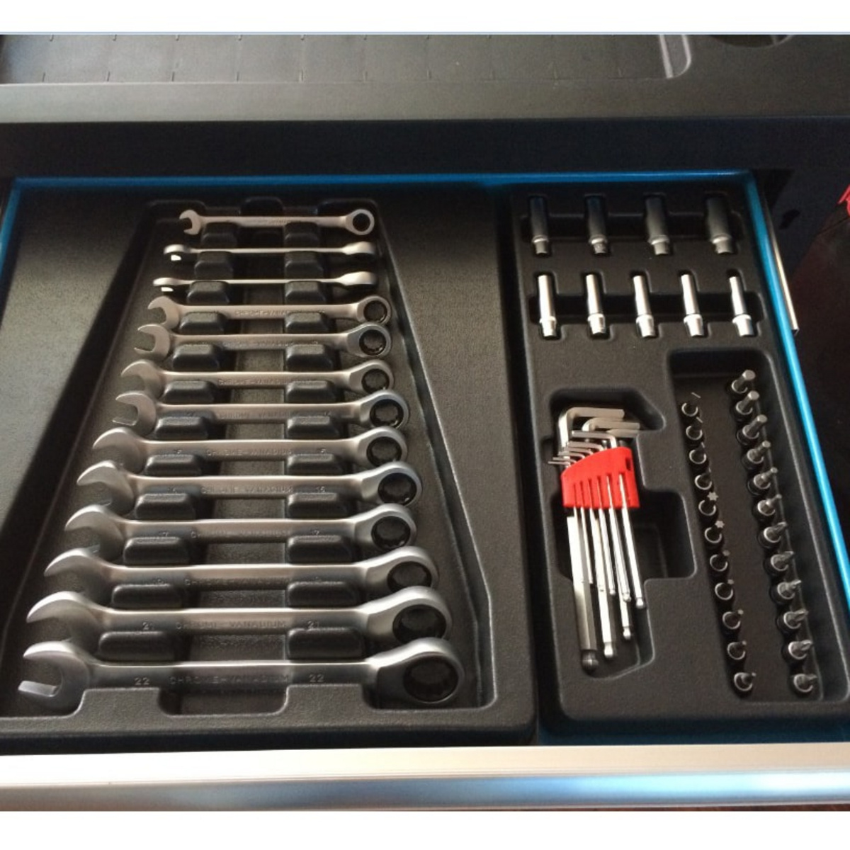 Timco verktøyvogn med verktøy 6 skuffer 220 deler er et høykvalitets og allsidig valg. Verktøyvognen inneholder et omfattende utvalg på 220 holdbare og moderne verktøy, hver med sin egen plass. Det er sterke møbelhjul under verktøyvognen, som gjør det lett og enkelt å flytte den. Verktøyvognen har seks lettglidende skuffer med kulelagre. Skuffene i verktøyvognen kan låses, slik at du kan beskytte innholdet.