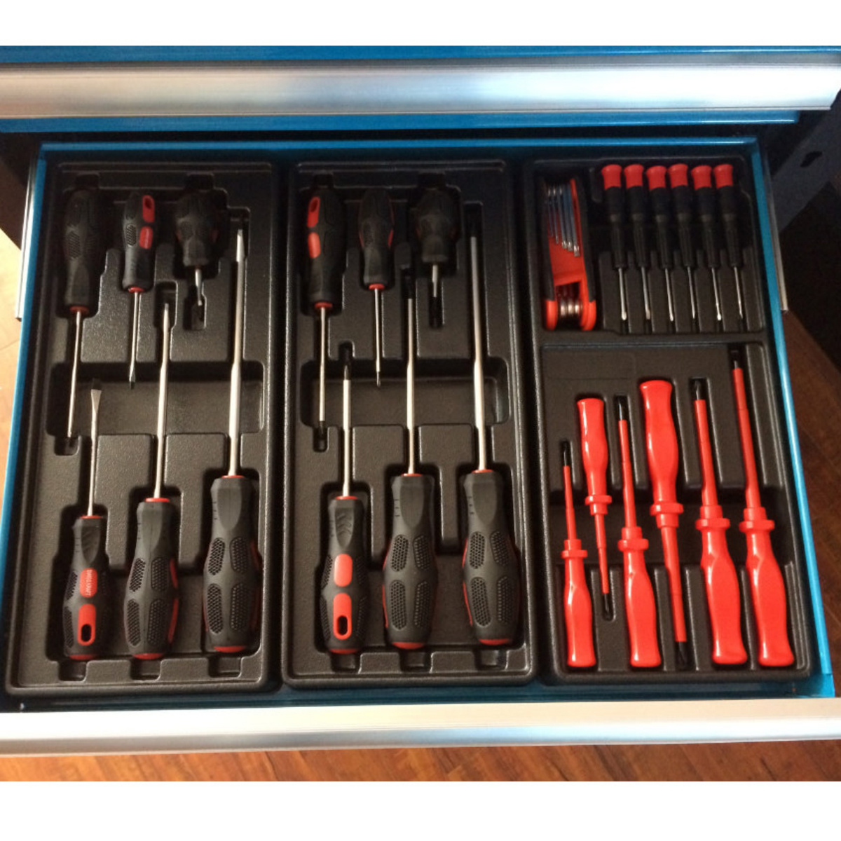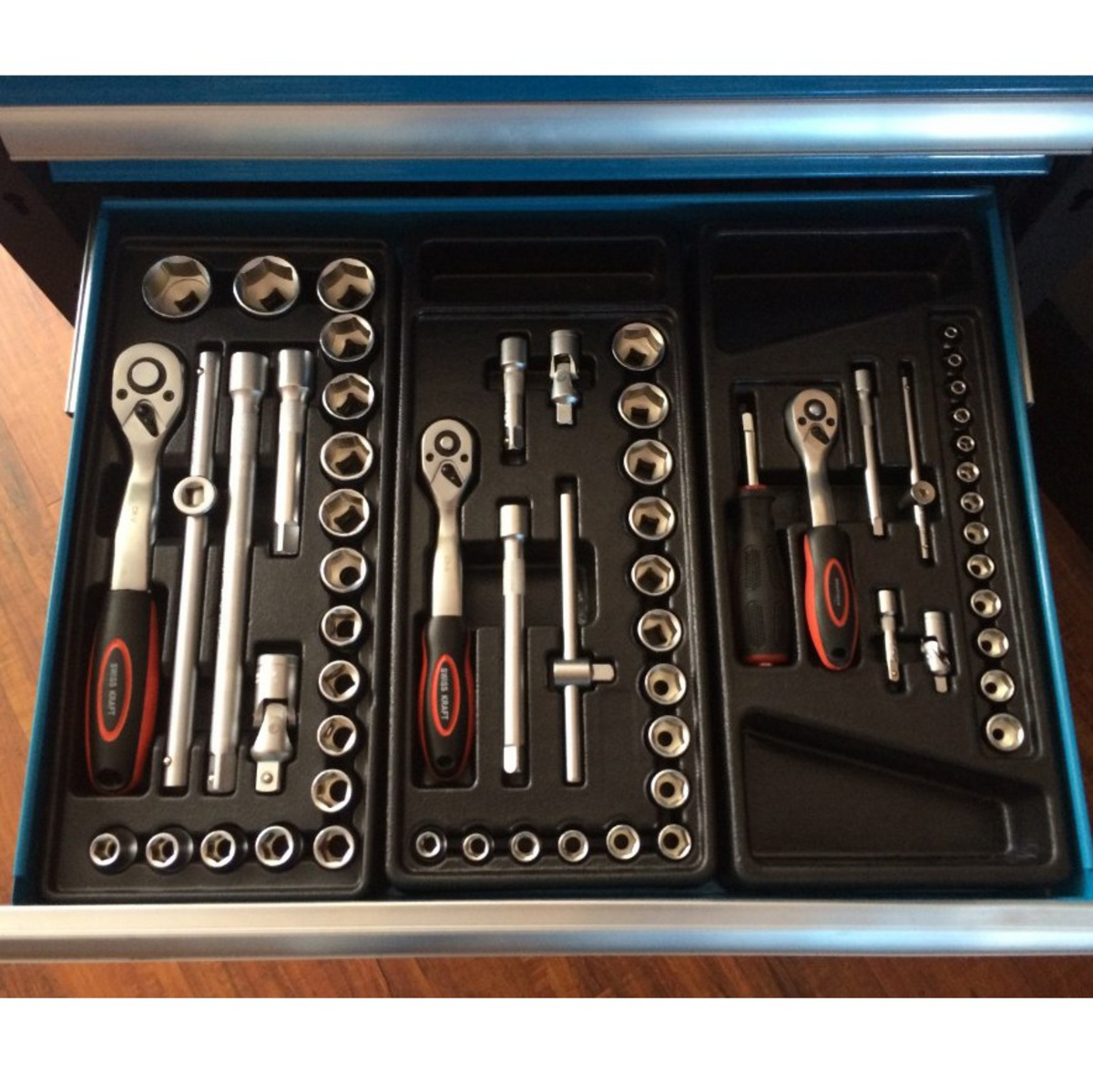 Timco verktøyvogn med verktøy 6 skuffer 220 deler er laget av slitesterke og høykvalitets materialer, som en aluminiumsramme, sterke hjul, solide skuffer og støtsikre hjørner.